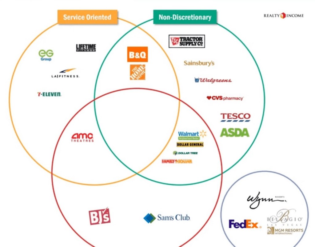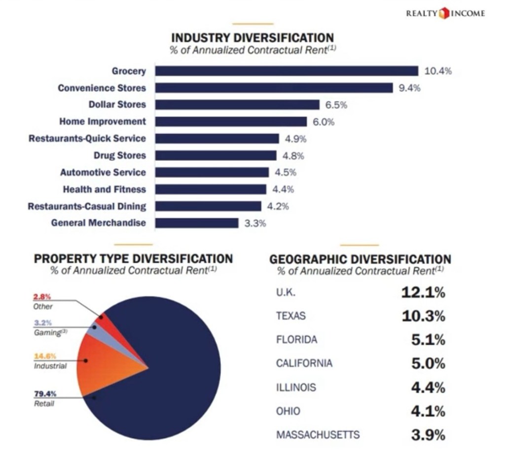 Realty Income (O) is a large net lease REIT, offering a healthy dividend yield of 5.6%. The company is large and well diversified, owning more than 15400 properties across 8 countries.