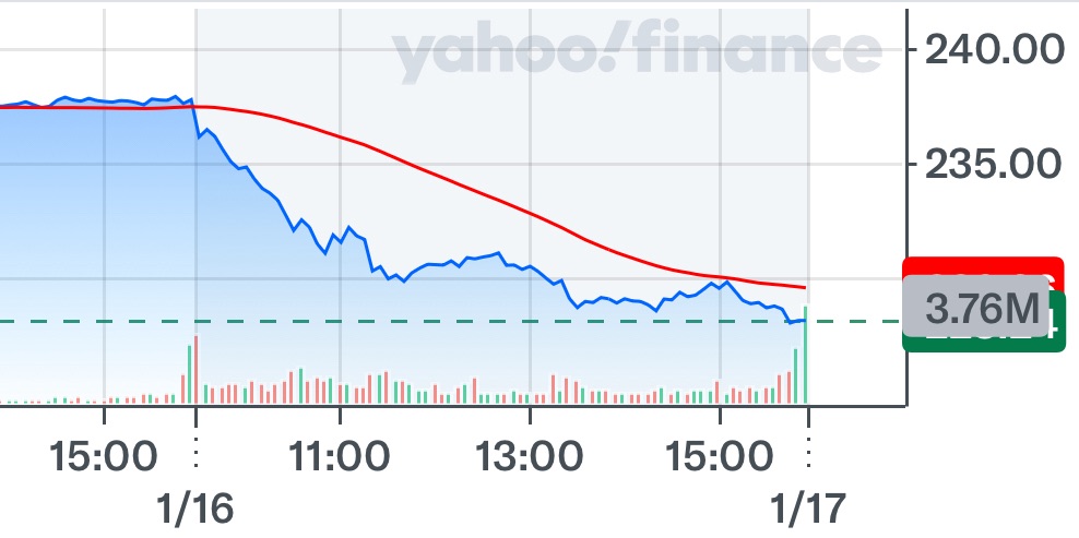 Shares are now trailing under the 50-day moving average at the $230 mark. This next support level for the stock will sit on the $220 mark which is just above the 200-day moving average. If this level is reached, further selling will ensue. The momentum of the stock is therefore very reliant on Apple’s earning report on Janurary 30. Whilst Apple stocks have a long term bullish outlook, it is important to be diligent about the short term bearish trend.