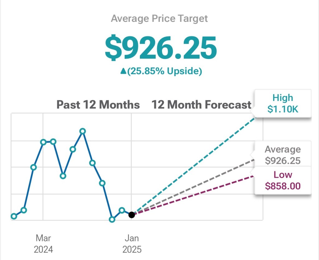 As demand for chips increases, ASML will benefit significantly as they are the only suppliers of the machines that are able to build these chips. The company has shown excellent Q4 results – revenue growing by 28% and 2025 outlooks are looking promising. The company currently has an average price target of $926.
