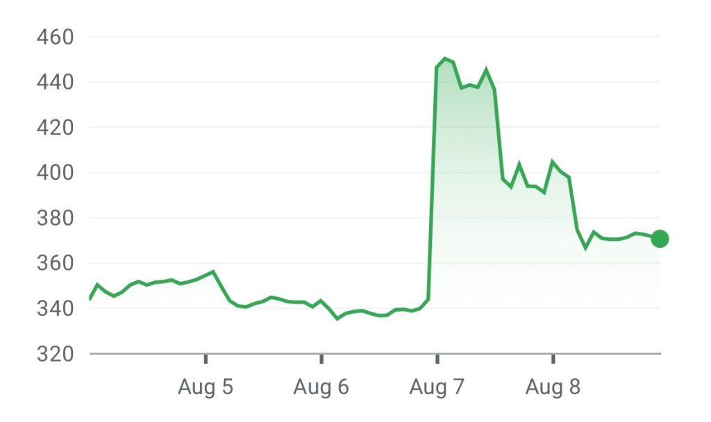 The 27% surge on August 7 sent shares up to a price of $450 after the stock began slipping back in May.